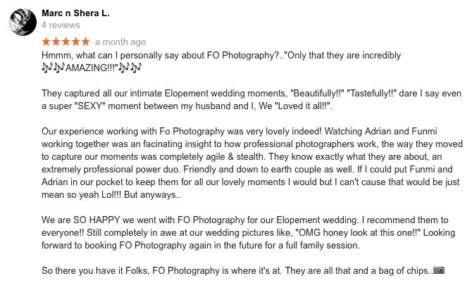 Congratulations again, dear Shera & Marc! Thanks for choosing FO Photography. We love this awesome review!